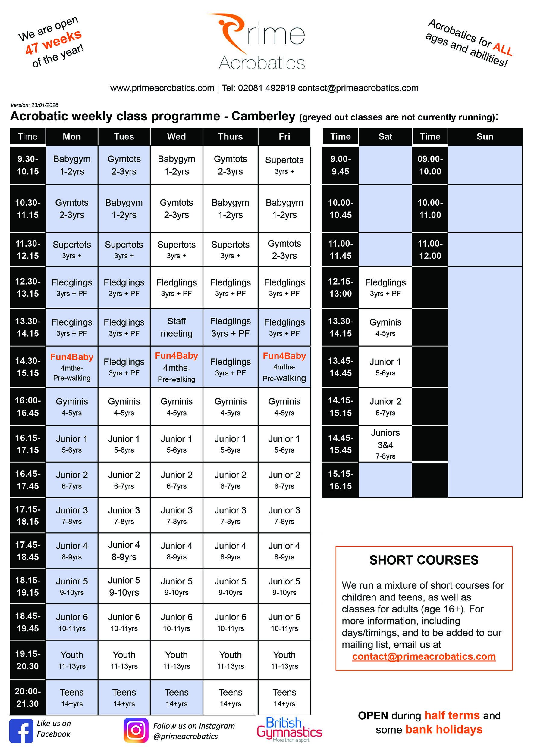 Our classes do not typically follow the school system. We run for 47 weeks of the year continuing through half terms with one week off at Easter, two during the Summer and two at Christmas. Each class is paid for monthly by Direct Debit. For more information on the price of each class please contact us.